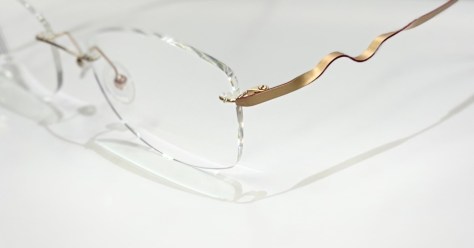 レンズをネジで止めていないので視界も広く、テンプルの捻りが素敵なアクセントの、和服にもよく似合うきれいなフチなしのメガネです。