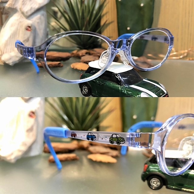 特に小さなお子様は成長に合わせて微調整ができて、弾力性のある軽い材質の安全なお子様専用フレームがお勧めです。今回は親御さんもD君もTOMATOシリーズの『TOMATO GLASSES kids-A-TKAC3-40』クリアなブルーに車のイラストが可愛らしいフレームに決まりました。